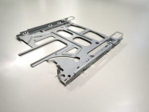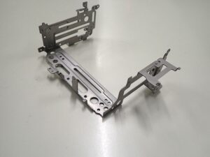段階曲げで曲げ量を各ステージに配分し、初期工程でプリフォーム(予備曲げ)を実施。さらに、先端部のコーナーR最適化と局所的なノッチ量の微調整で応力集中を緩和し、亀裂の起点を抑えました。戻り量を見込んだ金型スプリングバック補正で、最終角度の安定化も図っています。